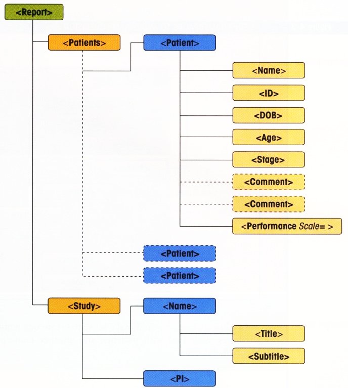 Design a merge of two XML documents. One document with the root element <Patiens> stores information on patients enrolled in some clinical studies. The other one with the root element <Study> contains information about these studies. The documents have to have the elements shown below. The optional elements are indicated by dotted lines.